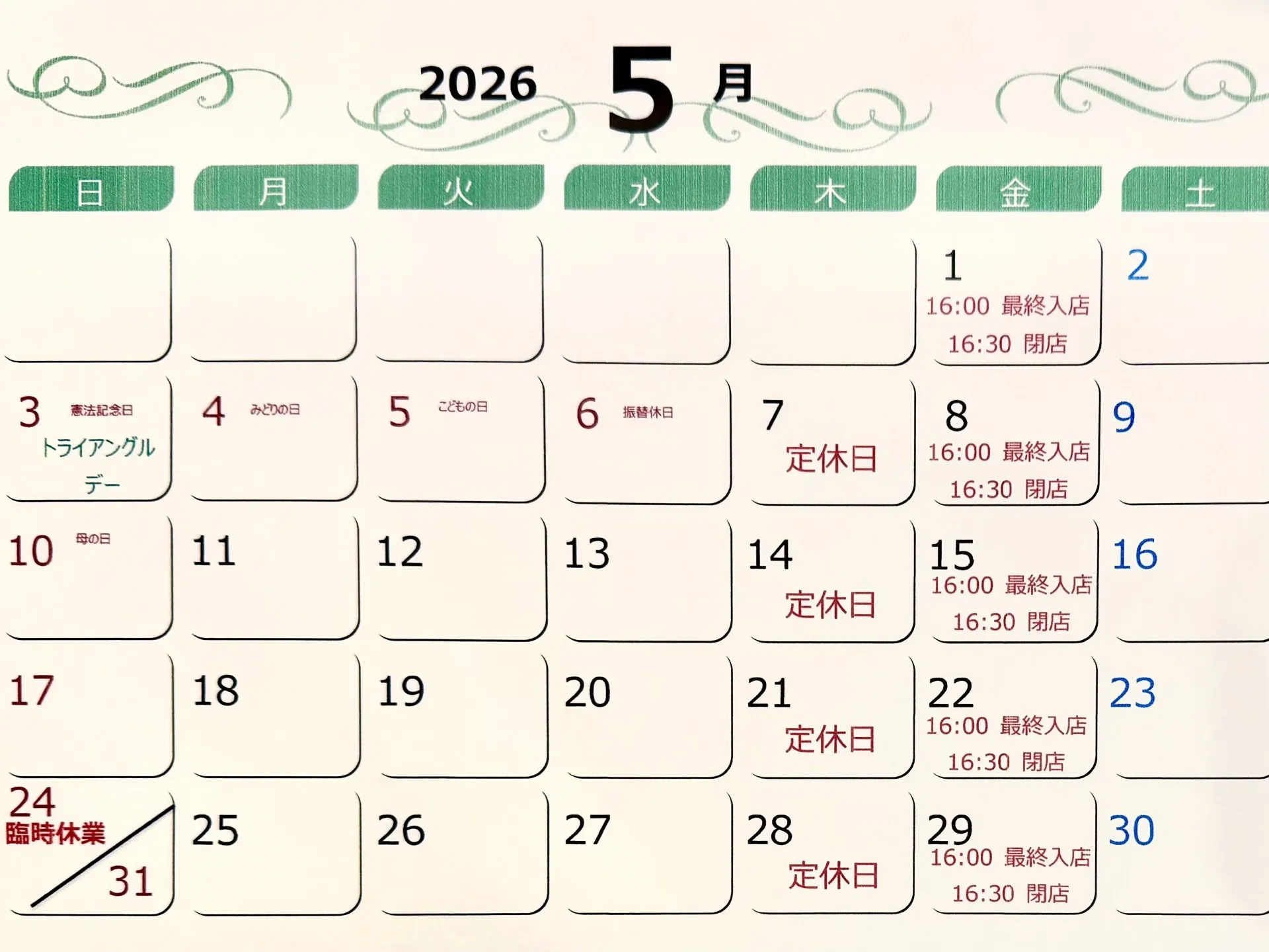 2026年5月 営業日程 2026/04/22 いつもトライアングル大名をご利用いただき誠にありがとうございます 2026年5月営業日程のご案内です。 トライアングルデーは5月3日です 5月24日(日)は臨時休業いたします。 11:00-20:00(最終入店19:30) 毎週木曜日:定休日 毎週金曜日16:30閉店(最終入店16:00)